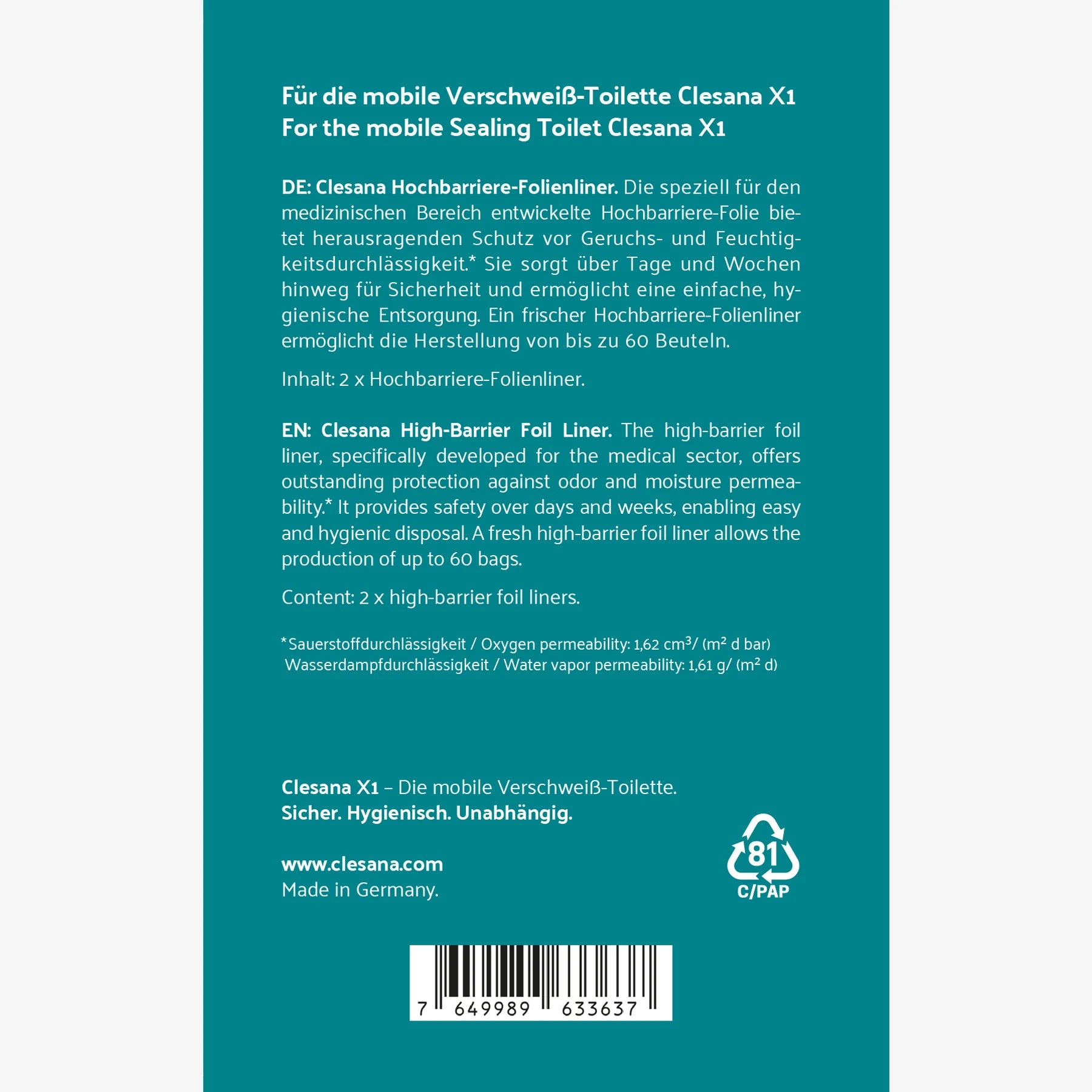 Die speziell für den medizinischen Bereich entwickelte Hochbarriere-Folie bietet herausragenden Schutz vor Geruchs- und Feuchtigkeitsdurchlässigkeit. Sie sorgt über Tage und Wochen hinweg für Sicherheit und ermöglicht eine einfache, hygienische Entsorgung. Ein frischer Hochbarriere-Folienliner ermöglicht die Verschweißung von durchschnittlich 50-60 Beuteln, abhängig von der gewählten Beutelgröße am Bedienfeld der Clesana X1.
